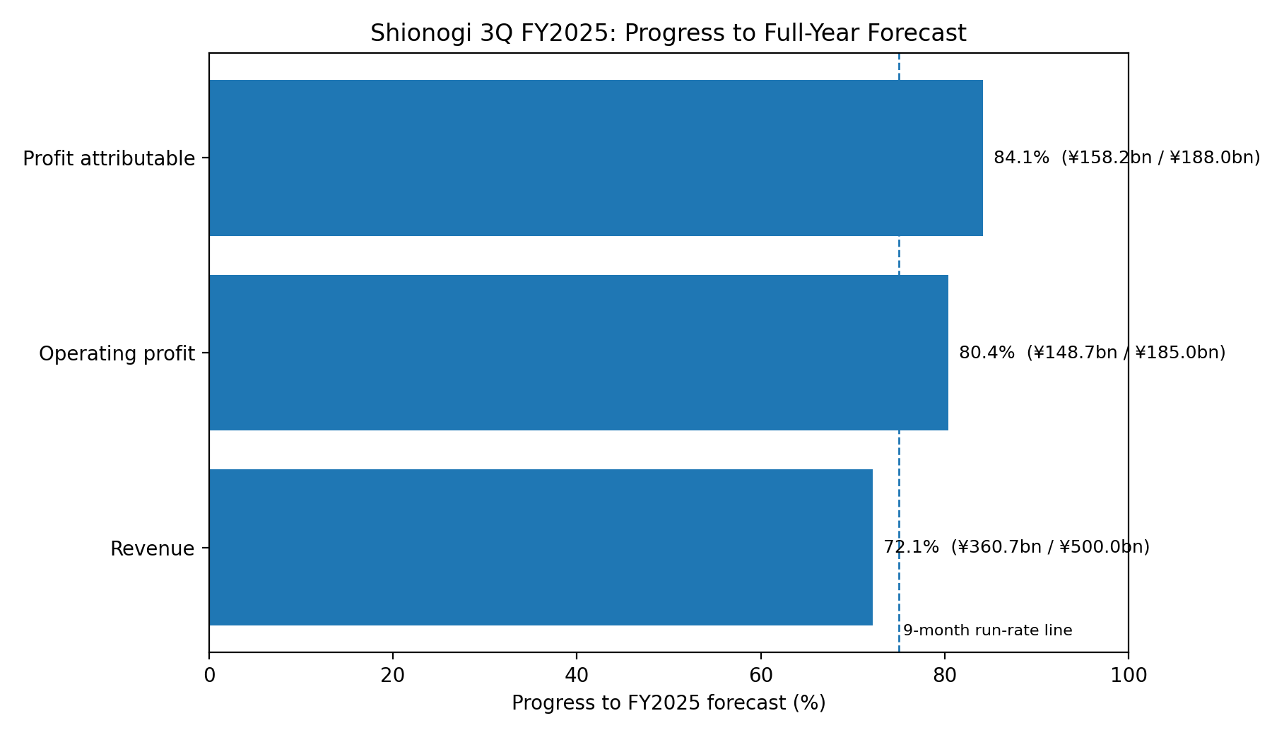 At the Q3 FY2025 stage, Shionogi had already reached 72.1% of full-year revenue guidance, 80.4% of full-year operating profit guidance, and 84.2% of full-year profit-attributable guidance.