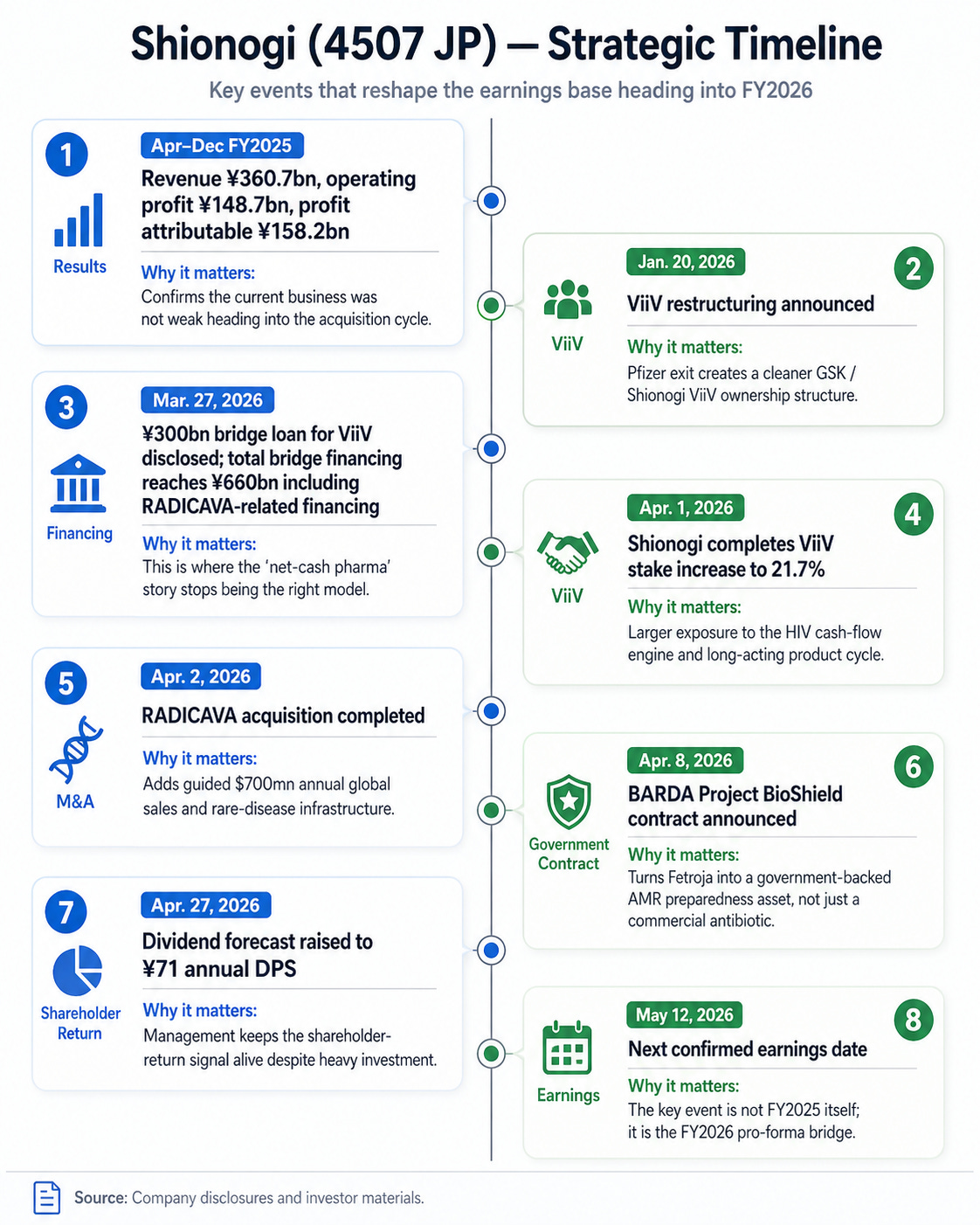 The result is a re-underwriting of what Shionogi’s earnings base should be worth after the balance sheet is put to work. The issue is whether management has just spent the old balance-sheet story on assets that extend the duration of the earnings base. The next serious checkpoint is the FY2026 guide, especially the bridge from ViiV, RADICAVA, financing cost, amortization, and post-deal leverage.