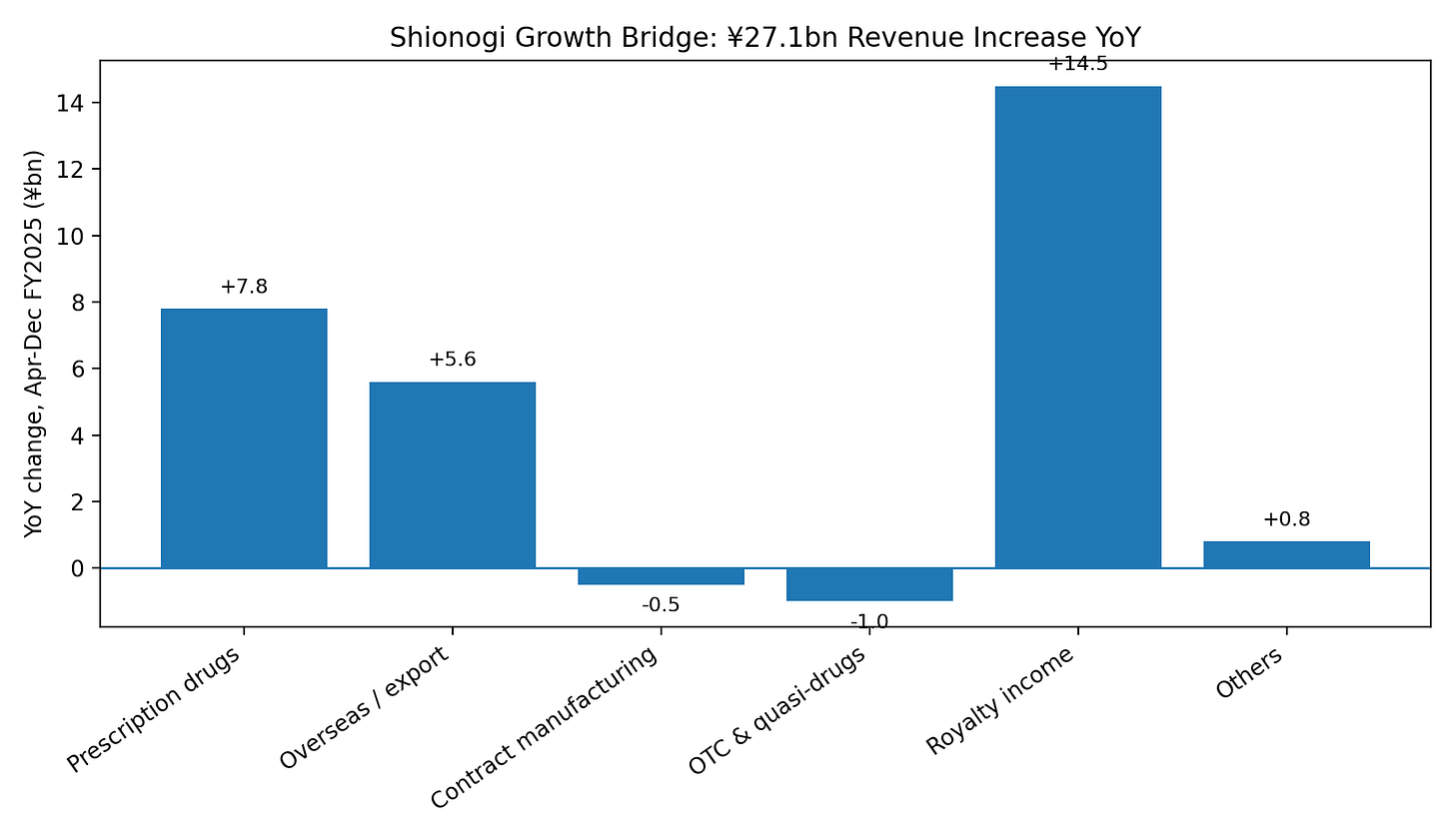 The JT / Torii transaction rounds out the domestic base. Shionogi agreed in 2025 to succeed Japan Tobacco’s pharmaceutical business, acquire Akros, and make Torii a wholly owned subsidiary. JT’s pharmaceutical business had fiscal 2024 net sales of ¥44.942bn. The strategic logic is not glamorous, but it is coherent: more small-molecule discovery capacity, more domestic breadth, and more non-infectious-disease exposure.