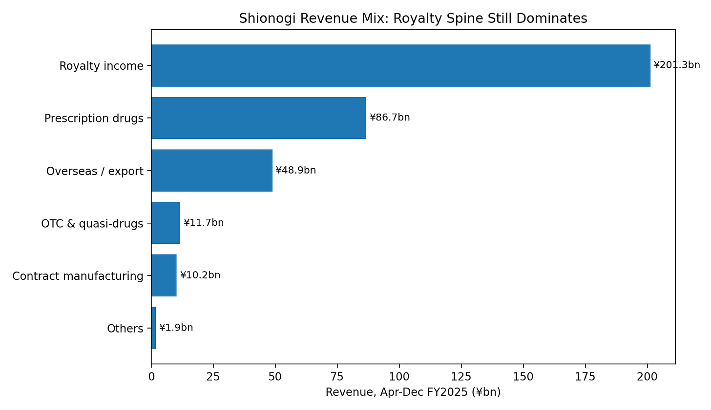 Within the royalty line, the HIV franchise was ¥193.4bn. In plain terms: Shionogi is still economically anchored by HIV royalties more than by its domestic prescription-drug business.