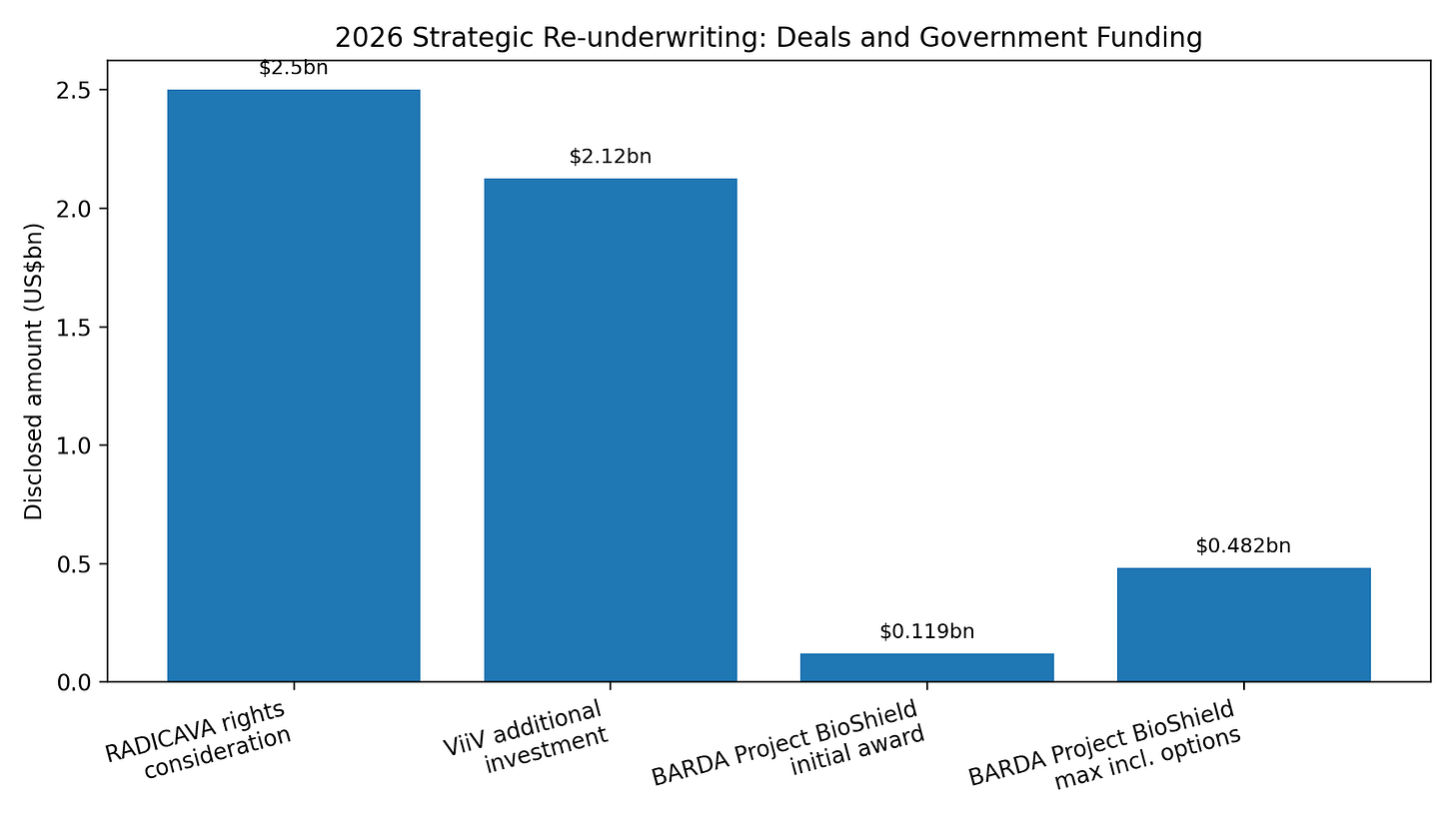 Third, Shionogi received a BARDA Project BioShield contract for Fetroja / cefiderocol. The contract is initially funded at $119mn, with multiyear options up to $482mn, and includes U.S. manufacturing, procurement, and development work for infections caused by high-priority biothreat pathogens.