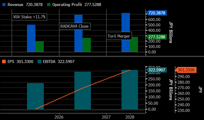 Revenue steps up to ~¥720bn by FY2028 on RADICAVA, Torii, and ViiV, with operating profit ~¥278bn and EBITDA ~¥323bn; EPS reaches ~¥301, still lagging EBITDA as interest and amortization come through after the ~$4.5bn of deals. The shape here points to disciplined reinvestment: earnings scale and if leverage trends down and cash flow follows into FY2028, the step-up holds.