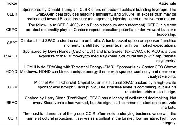 Each position is selected not for what it might become, but for what it already structurally is: a low-drag vehicle tethered to a known liquidation floor, with upside potential tied to the quality and optics of the eventual business combination.