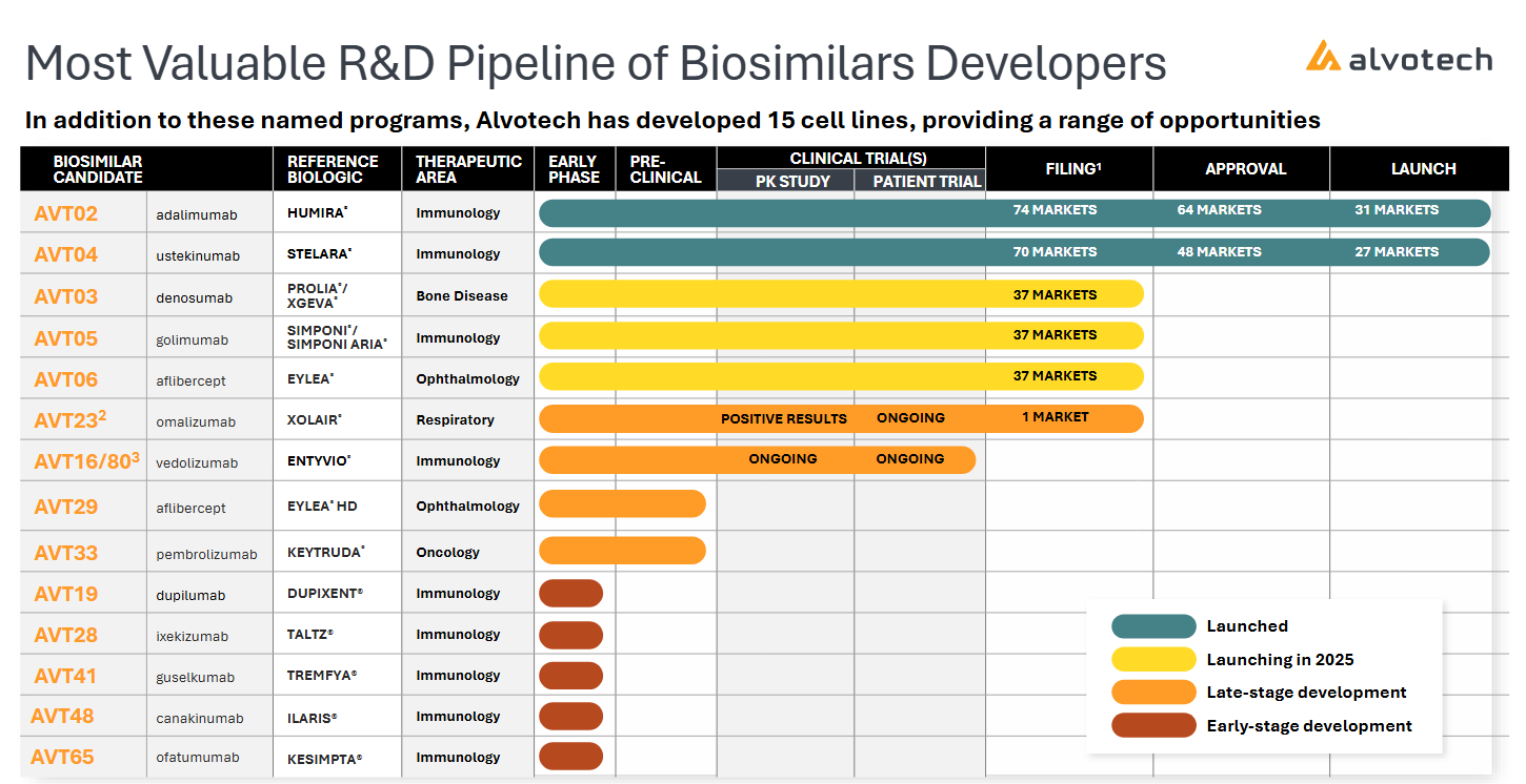Beyond the blockbuster biosimilars (Humira, Eylea), Alvotech’s pipeline includes biosimilar candidates for orphan and specialty indications. Through its Advanz Pharma collaboration, it’s developing copies of drugs like canakinumab (IL-1 inhibitor for rare autoinflammatory syndromes) and ofatumumab (B-cell therapy for multiple sclerosis). These target markets combine high biologic pricing and low patient counts, allowing biosimilars to enter rare-disease economics without the risk of true novelty R&D. In short: Alvotech leverages its scale into rare biology adjacencies, where pricing power and reimbursement stability mirror orphan-drug dynamics.