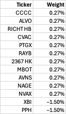 Setup: 3% long sleeve of 11 rare-disease and specialty healthcare names (~0.27% each) vs. -3% short split XBI/PPH (≈50/50) for a near market-neutral expression.