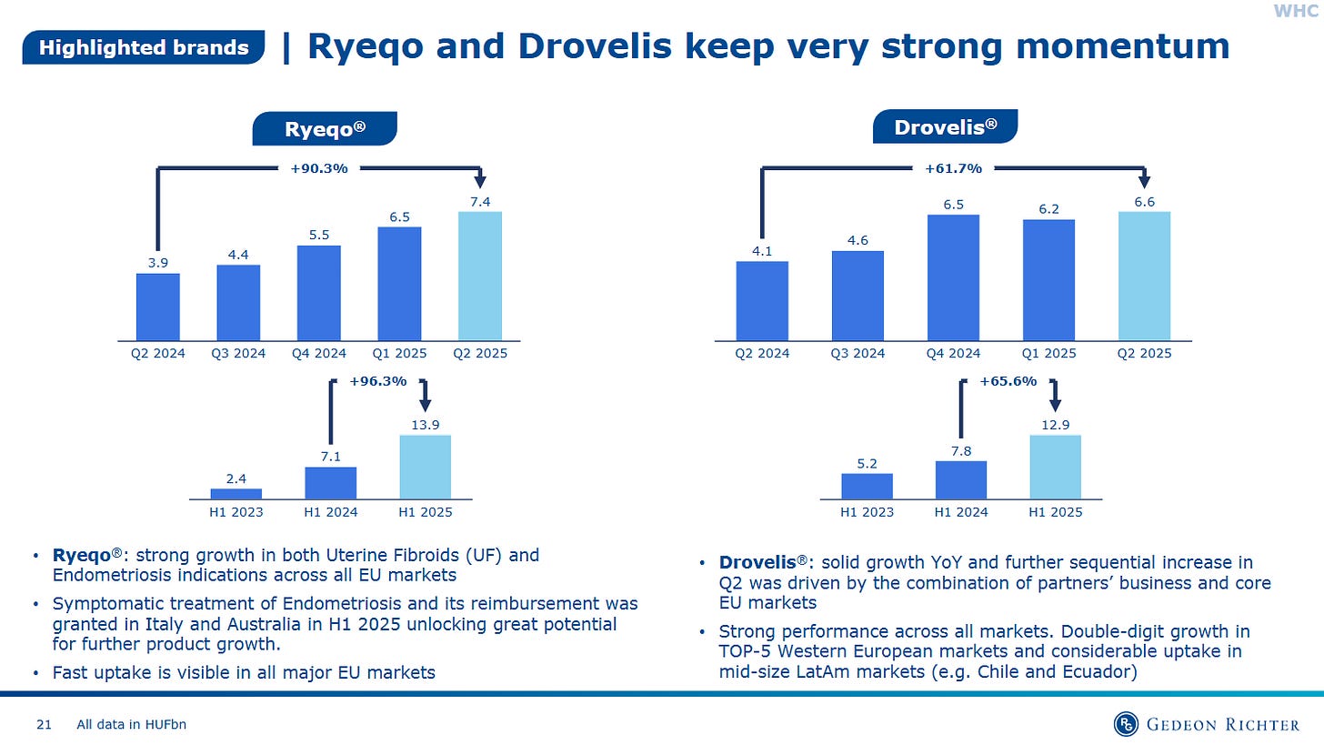 The Vraylar royalty stream smooths earnings volatility, while the women’s health division contributes recurring product revenue, a dual-channel model that gives Richter the financial elasticity to invest through downturns. Few mid-cap pharmas have such a balanced setup: one global royalty annuity (CNS) and one fully-owned cash cow (hormone-based therapies).Regulatory and geographic reach: