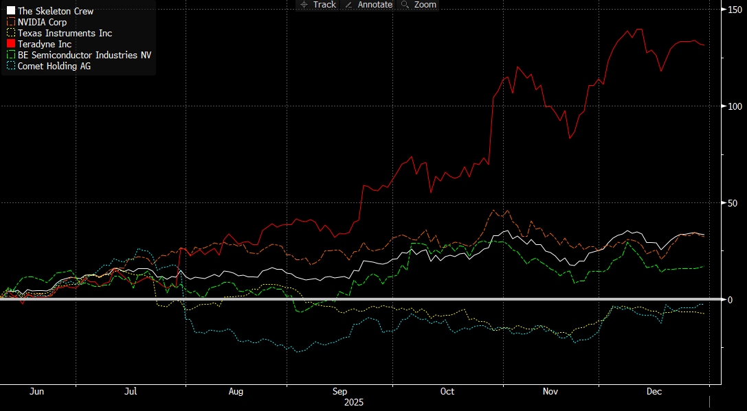 Notably, this research highlighted Teradyne’s dual exposure to robotics well before it became widely discussed. The analysis connected Teradyne’s ownership of Universal Robots and MiR, among the most widely deployed collaborative automation platforms, with its dominant position in semiconductor test. As robot intelligence increases, so does chip complexity, and every advanced processor, sensor, and memory component must be validated. This “picks-and-shovels” exposure to both physical automation and the silicon underneath it was identified early, ahead of broader commentary elsewhere (wink wink).
