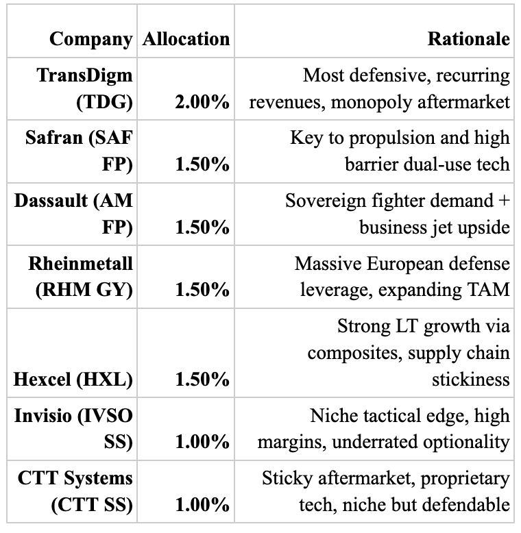 This portfolio emphasizes supply chain control, modularity, and sovereign procurement sensitivity. The goal is not to chase wartime spikes, but to own enduring franchises with high-margin, defensible niches in an increasingly kinetic world.