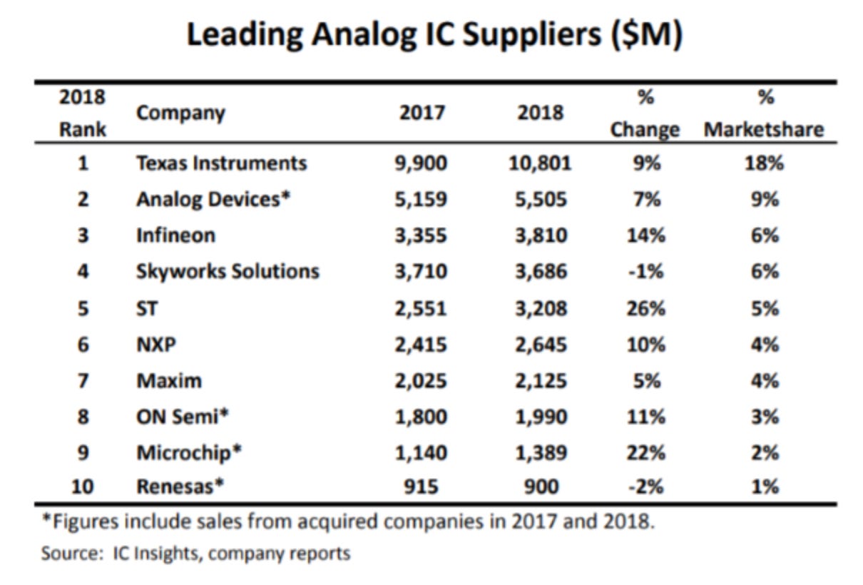 Texas Instruments leads the analog IC market, providing essential components for sensing and power management in robotics.