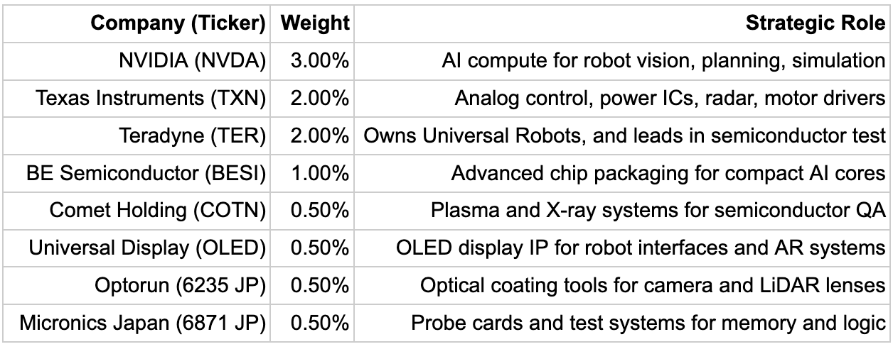 A 10% allocation to eight companies, weighted toward high-moat, high-margin players enabling the robotics stack. Each was selected based on durable competitive positioning, current product relevance, and exposure to the humanoid supply chain.