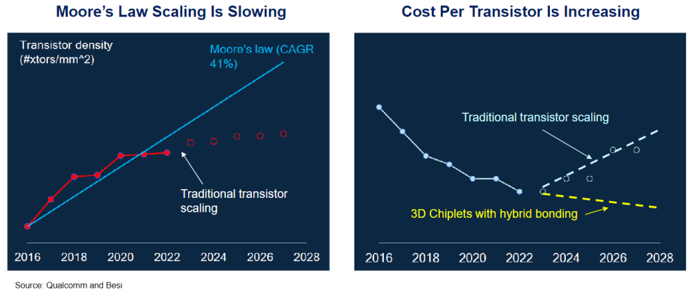 New Wafer Level Assembly Technologies Extend Moore’s Law: 3D chiplets with hybrid bonding extend Moore's Law by increasing transistor density beyond traditional scaling limits. These methods stack silicon chiplets vertically with ultra-fine interconnects, enhancing performance and reducing interconnect length, which surpasses the enhancements achievable through traditional 2D scaling.