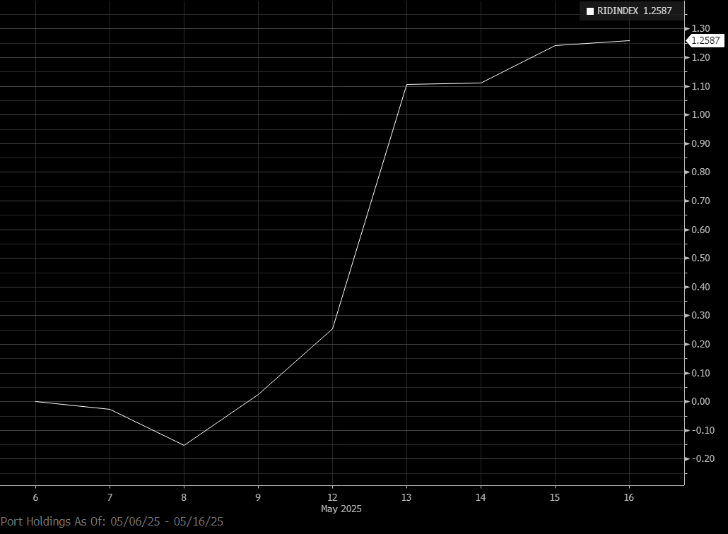 The Ridindex, our real-time model portfolio, remains net long. Thematically, we are concentrated in: